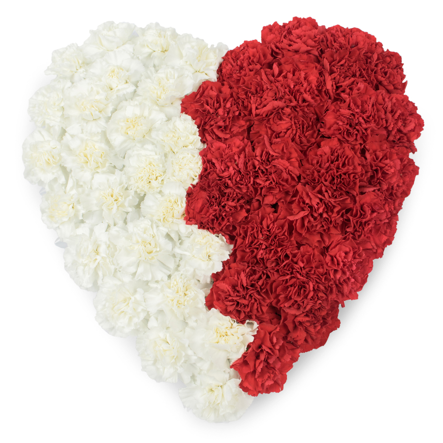 Immerse yourself in a display of elegance with our heart-shaped arrangement of hand-picked red and white carnations.
