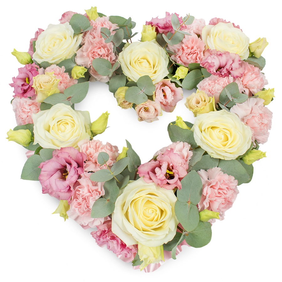 Express your heartfelt emotions with our Beautiful Open Heart Floral Tribute. This charming arrangement features elegant white roses, soft pink carnations, graceful pink lisianthus, and lush eucalyptus, artfully arranged to form an open heart.